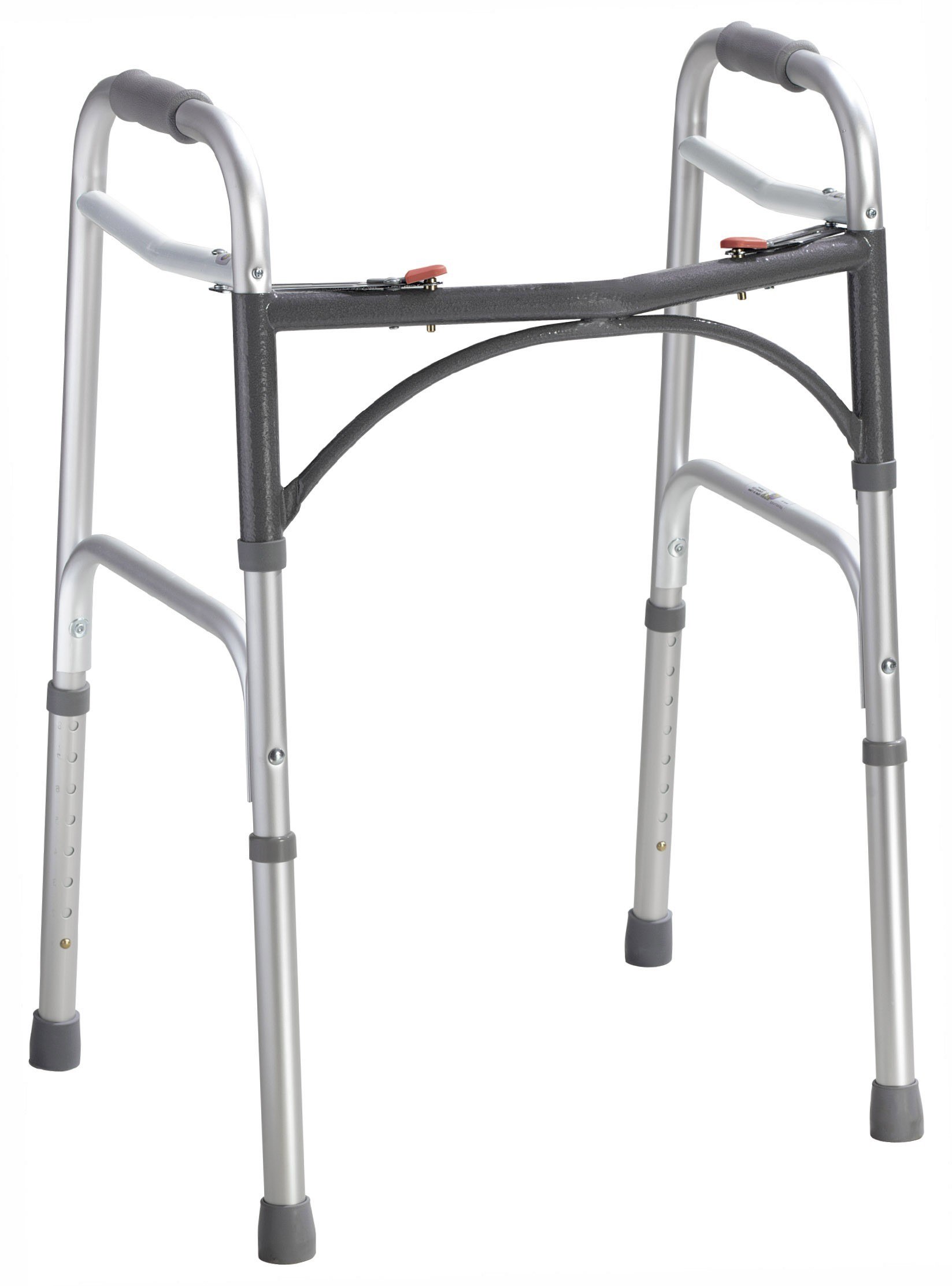 Fabricada en aluminio. Estructura plegable, con dos botones en la parte frontal. Barra frontal curva. Altura ajustable a 8 niveles. Regatones antiderrapantes. Soporta 110kg.