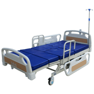 Cama eléctrica manual. Barandales plegables. 4 secciones para función de auto-silla. Manivelas laterales. Orificios porta suero o bolsas de orina. Cómodo integrado. Ruedas. Palangana para aseo de cabeza. ABS desmontables.