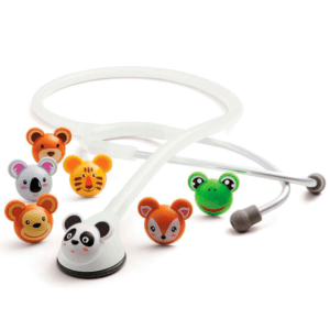 Estetoscopio pediátrico con campana de resina moldeada con diseño de animales. Campana retenedora de temperatura. Tubo suave y flexible. Auriculares ligeros de aluminio con acabado satinado. Olivas de silicón.