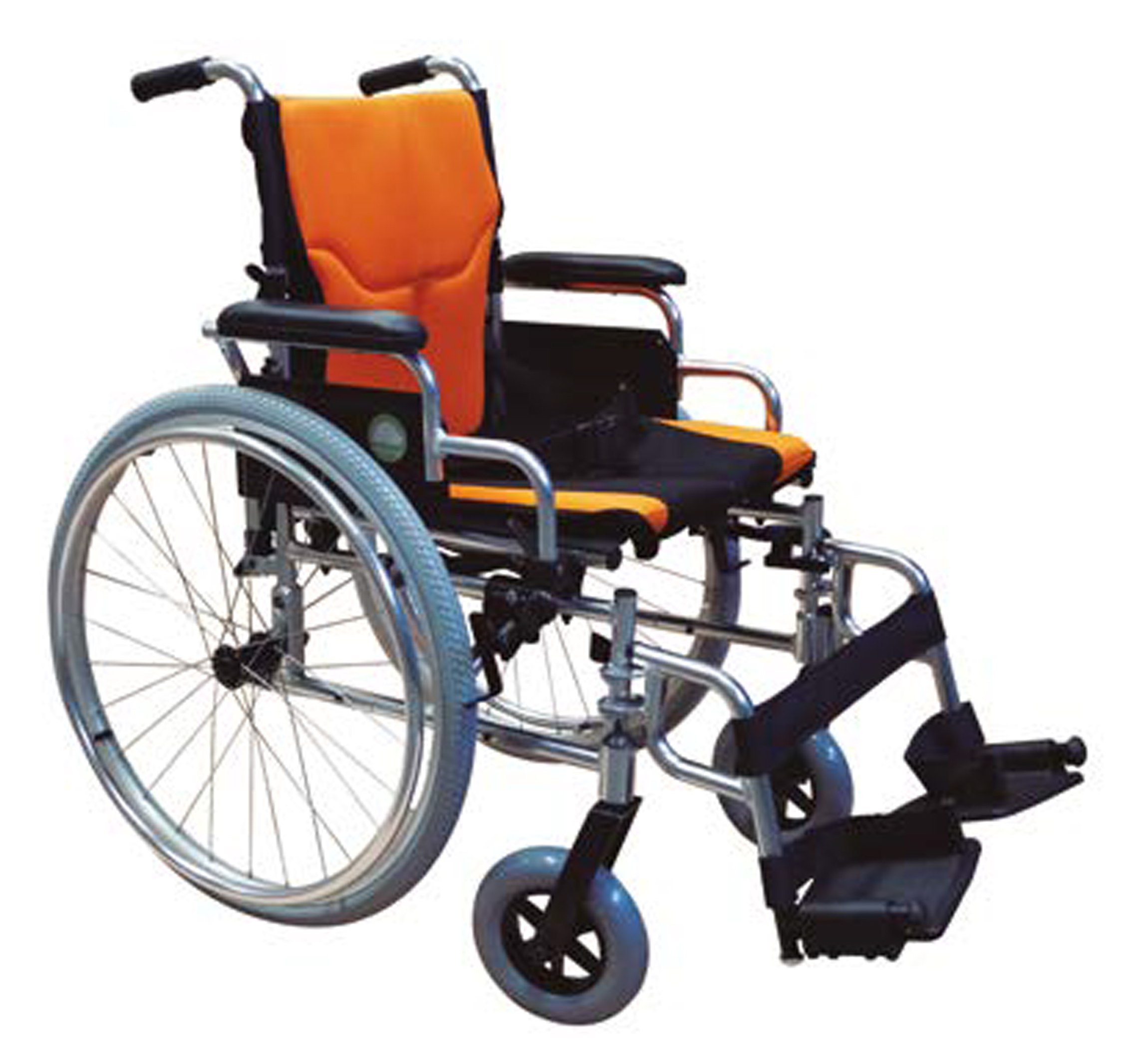 Fabricada en aluminio ultraligero. Asiento acojinado tipo deportivo, desmontable. Respaldo abatible. Descansabrazos abatible, con cojín de poliuretano. Descansapies removibles. Rines de aluminio. Soporta 100kg.
